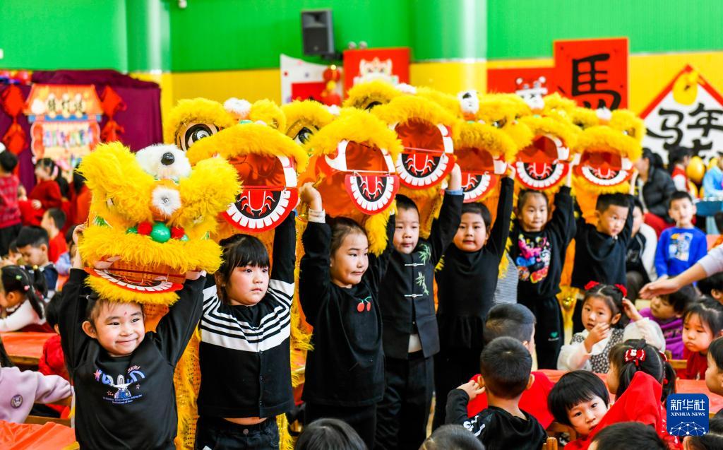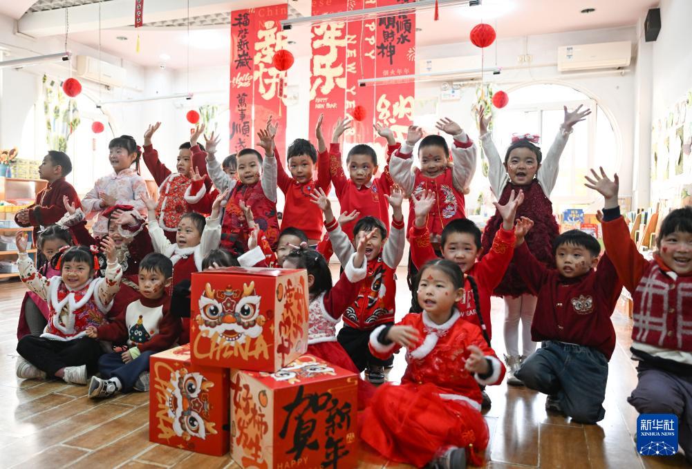 12月30日,在浙江省溫嶺市級(jí)機(jī)關(guān)幼兒園,孩子們與舞獅互動(dòng)。