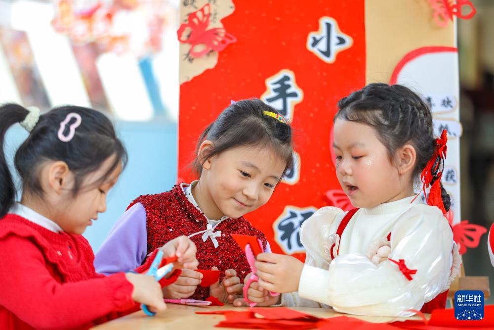 12月30日,小朋友在山東省青島市李滄區(qū)青山路幼兒園開(kāi)展的迎新年活動(dòng)中體驗(yàn)剪紙。