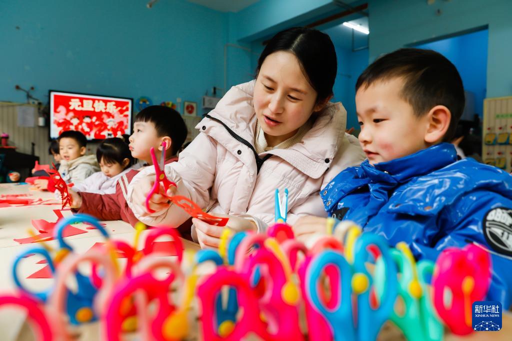 12月30日,在河南省武陟縣第一幼兒園,老師和小朋友制作新年剪紙。