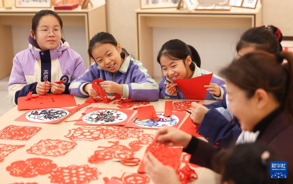 12月30日,河北省石家莊市天苑小學(xué)學(xué)生在非遺剪紙課堂上學(xué)習(xí)剪紙技藝。
