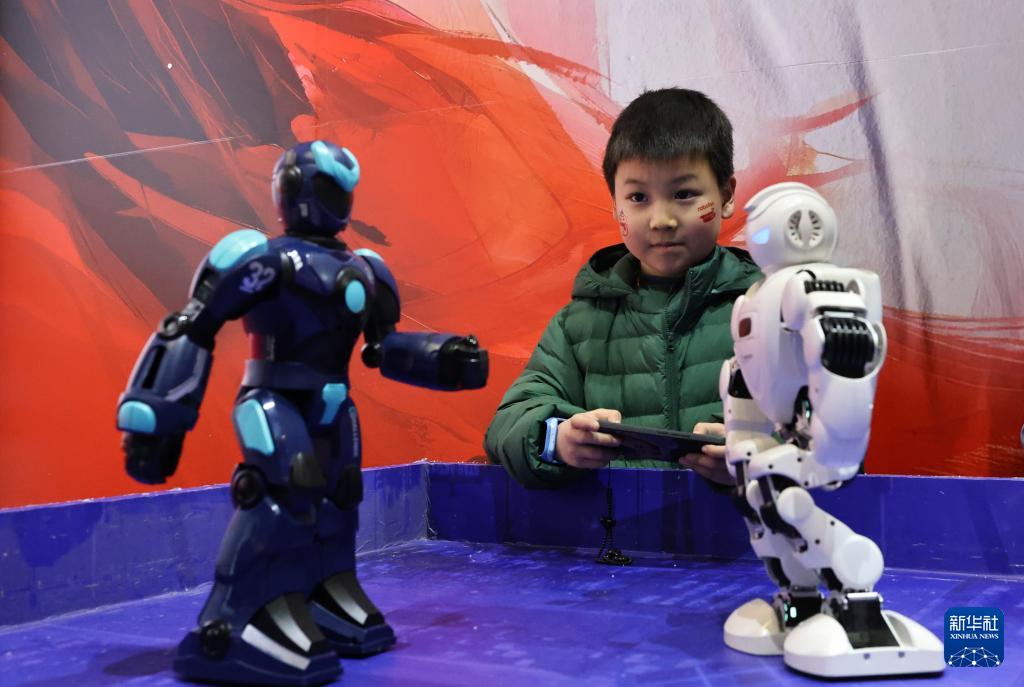 1月2日,參觀者在體驗操縱機器人進行格斗游戲。