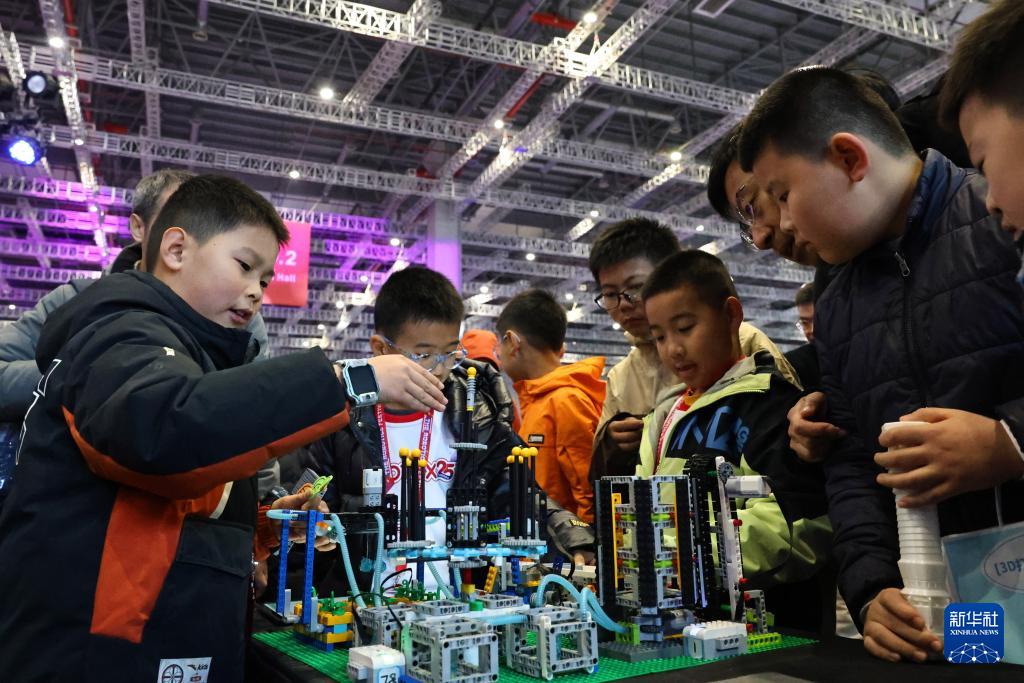 1月2日,一名小選手(左一)向參觀者介紹他的創(chuàng)意編程作品。