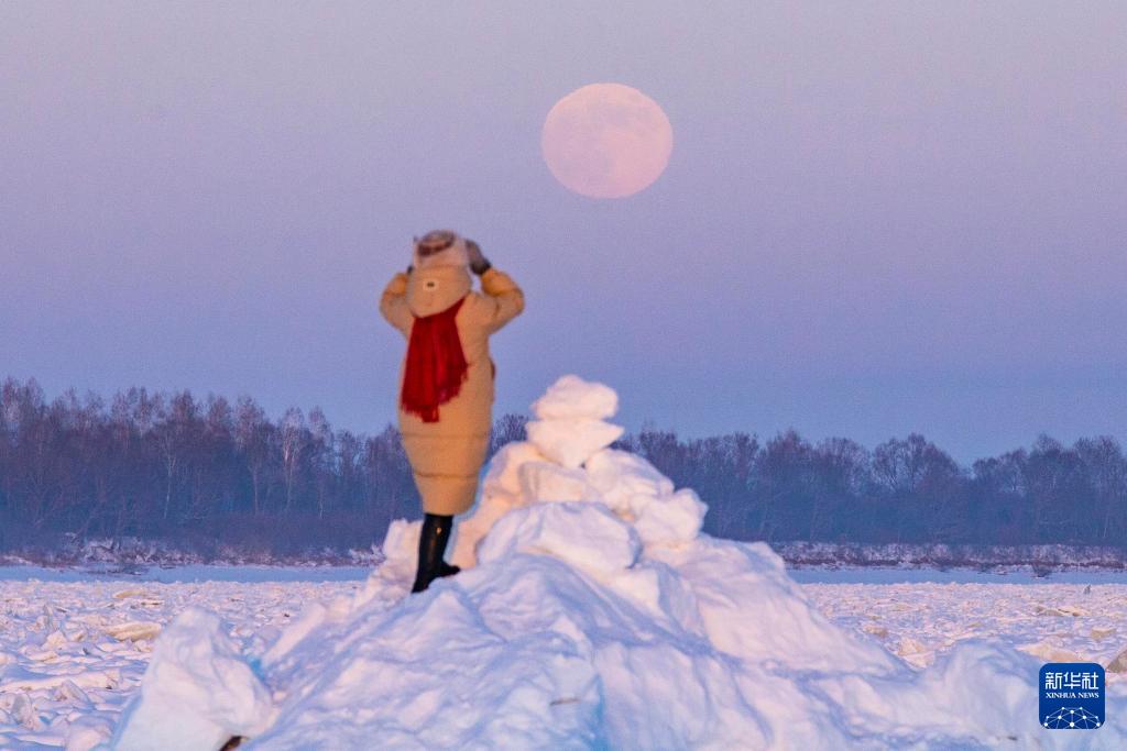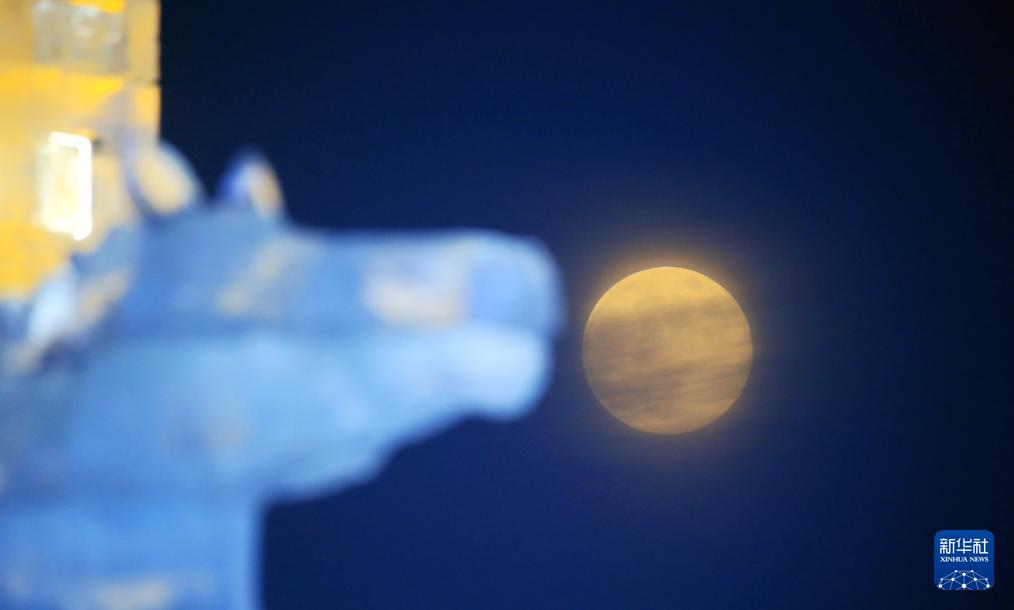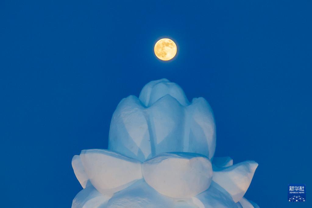 1月3日在黑龍江省哈爾濱市冰雪大世界園區(qū)拍攝的月亮。