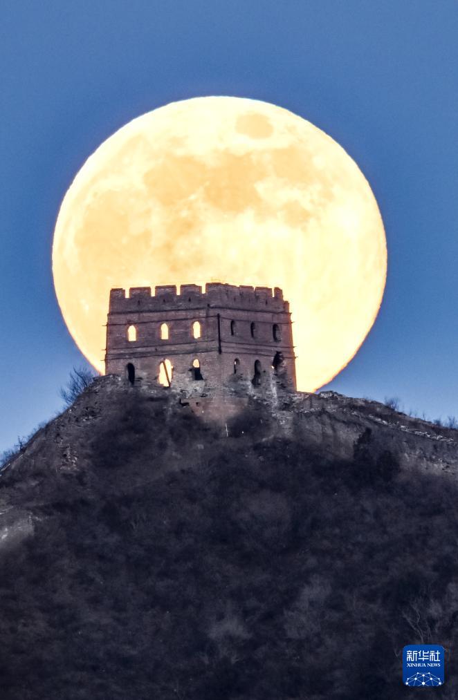 1月3日在北京市密云區(qū)古北口鎮(zhèn)拍攝的蟠龍山長城二十四眼樓與月亮。