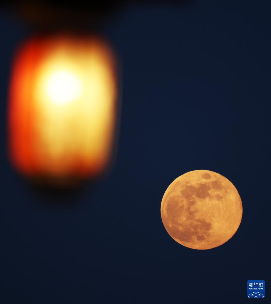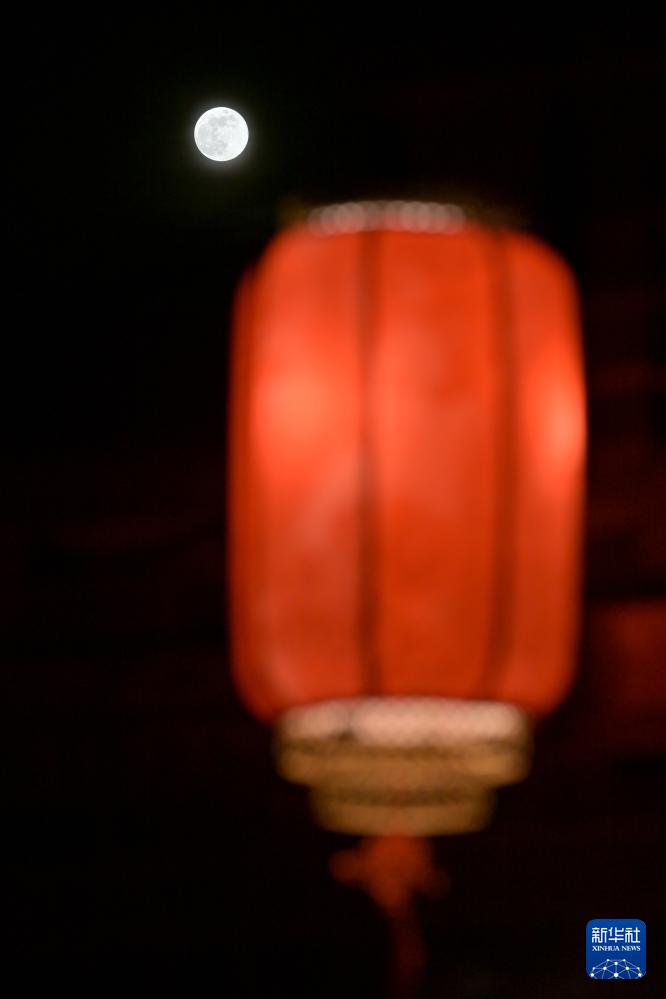 1月3日在北京拍攝的月亮和傳統(tǒng)燈飾。