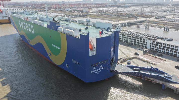 2025年12月9日,在江蘇省蘇州港太倉(cāng)港區(qū),“港榮”號(hào)甲醇雙燃料動(dòng)力滾裝船在裝載出口汽車(chē)(無(wú)人機(jī)照片)。新華社發(fā)(計(jì)海新攝)