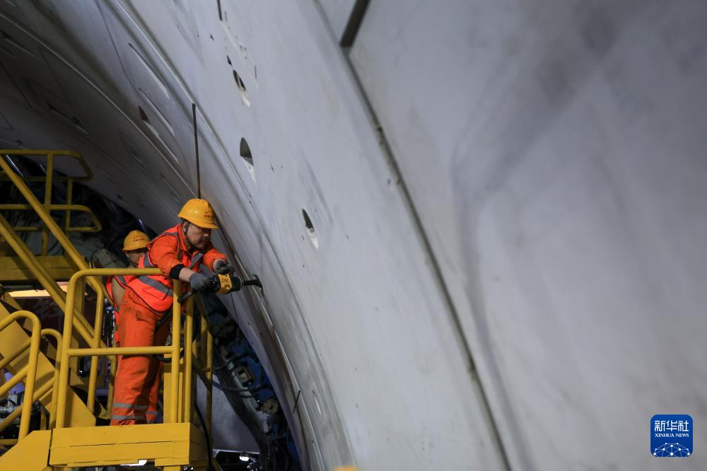 1月6日,中鐵十四局施工人員在“深江1號(hào)”盾構(gòu)機(jī)上進(jìn)行管片螺栓緊固工作。