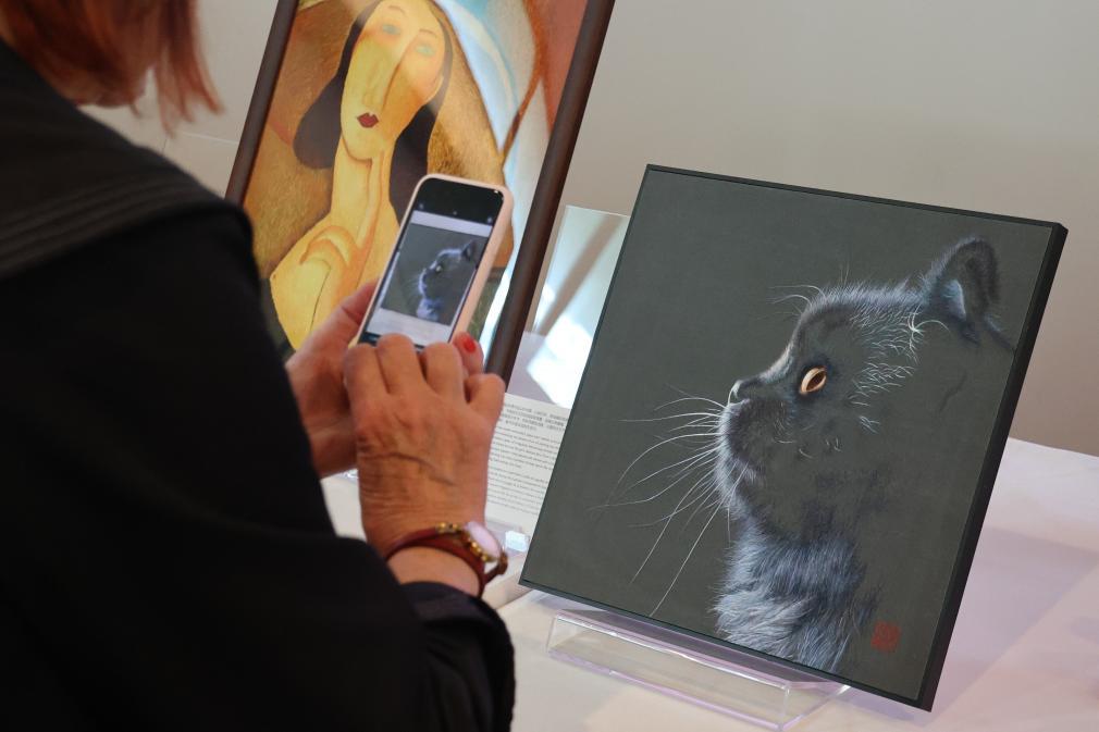 2025年9月4日,觀眾在法國巴黎中國文化中心參觀《一針不多一針不少的蘇繡》主題展時拍照留念。新華社記者 張百慧 攝