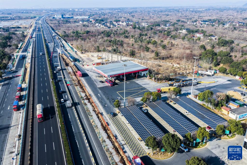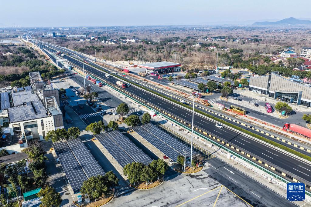 1月7日,空中俯瞰G50滬渝高速長興服務(wù)區(qū),太陽能光伏板下是剛剛升級(jí)完成的高速服務(wù)區(qū)充電站(無人機(jī)照片)。
