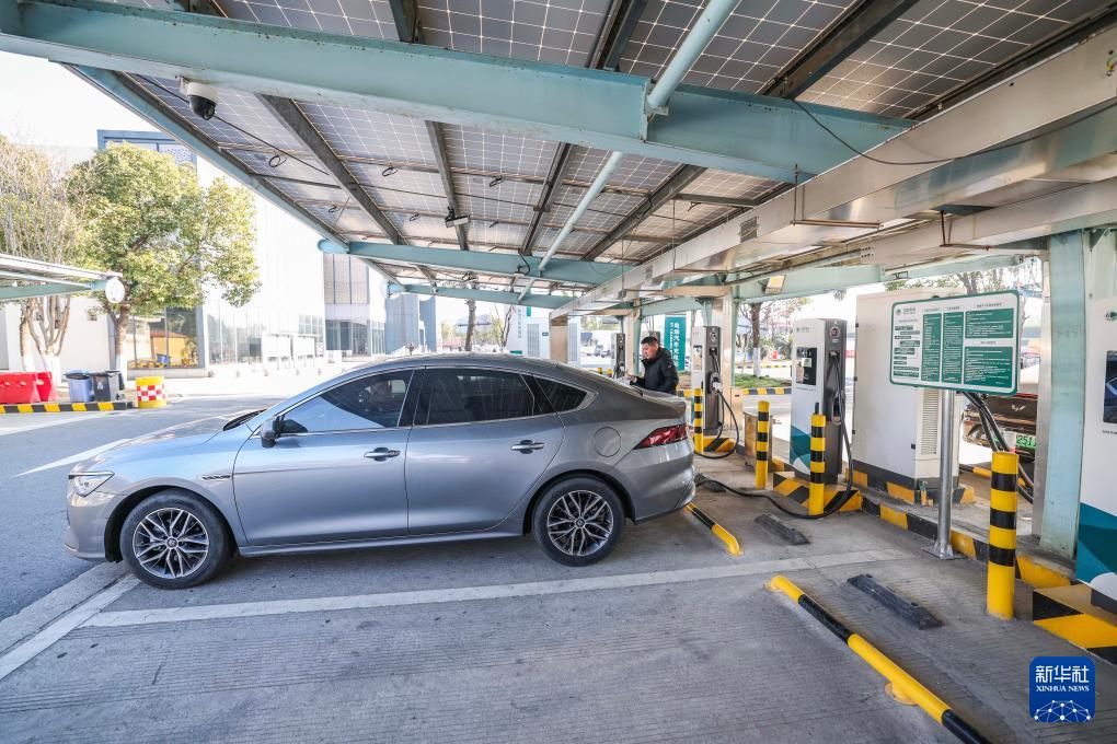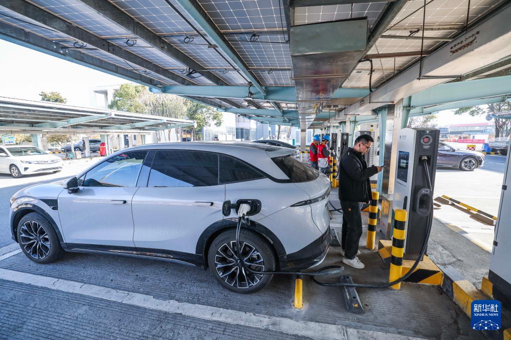 1月7日,在G50滬渝高速長興服務(wù)區(qū),新能源車主使用新安裝的大功率充電樁給車充電。