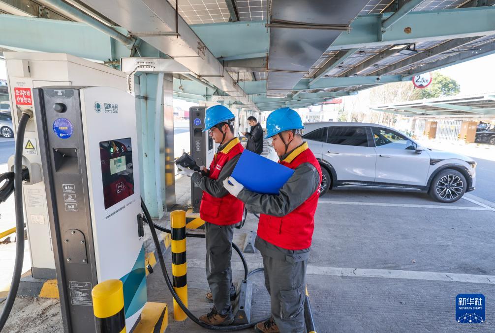 1月7日,國網(wǎng)湖州供電公司工作人員在G50滬渝高速長興服務(wù)區(qū)對(duì)新安裝的大功率充電樁開展巡檢。