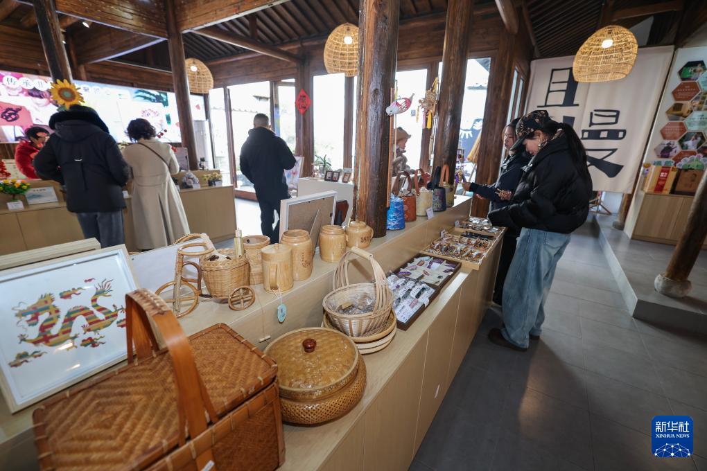 1月8日,游客在坡陽古街一家傳統(tǒng)手工藝店里選購商品。