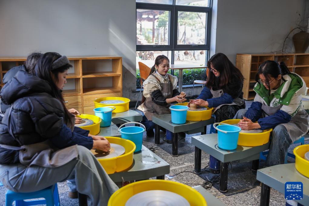1月8日,游客在金華市金東區(qū)古婺窯火陶瓷文化藝術(shù)館的體驗(yàn)區(qū)體驗(yàn)陶藝制作。