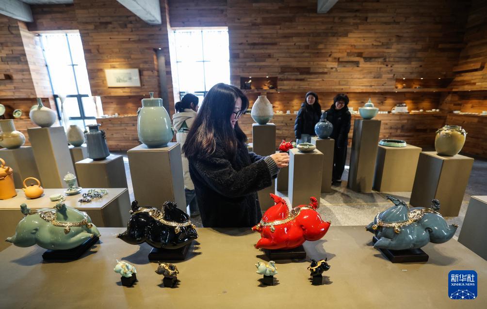 1月8日,游客在金華市金東區(qū)古婺窯火陶瓷文化藝術(shù)館里欣賞馬年陶藝“福馬乾坤”。古婺窯火陶瓷文化藝術(shù)館是以婺州窯為核心打造的文旅融合景區(qū),包含陶瓷制作車間、婺州窯展廳及博物館等區(qū)域。