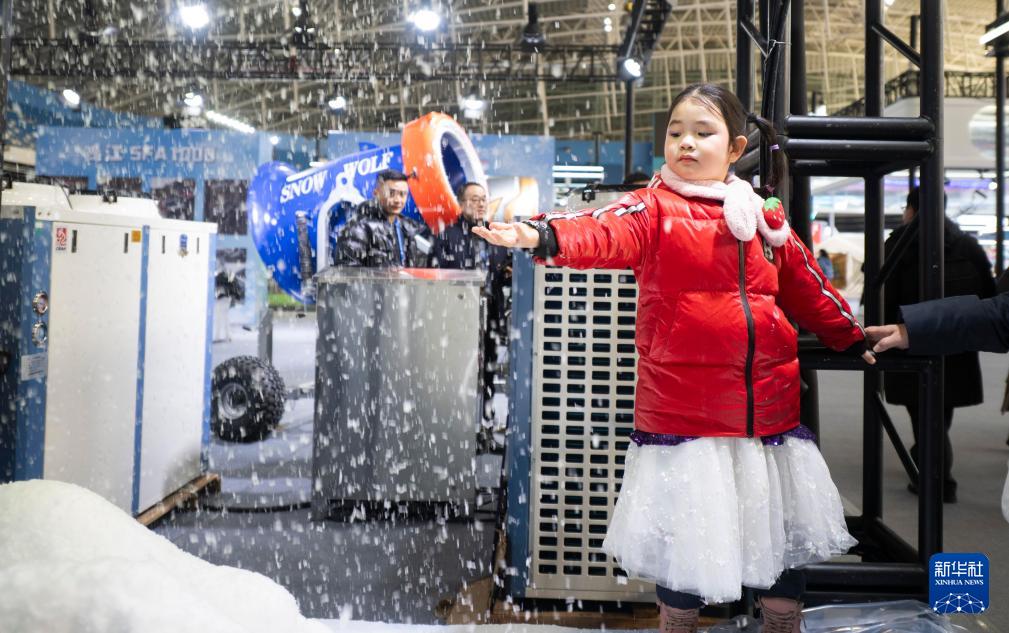 1月6日,在2026哈爾濱國(guó)際冰雪經(jīng)濟(jì)博覽會(huì)冰雪裝備展區(qū),小朋友觸摸制雪機(jī)現(xiàn)場(chǎng)制造的雪花。