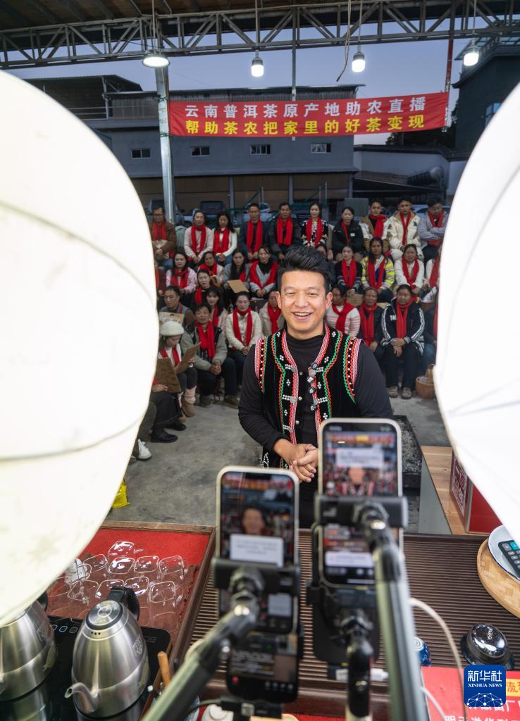 1月22日,主播在臨滄市雙江縣勐庫鎮(zhèn)通過電商直播推介茶葉。