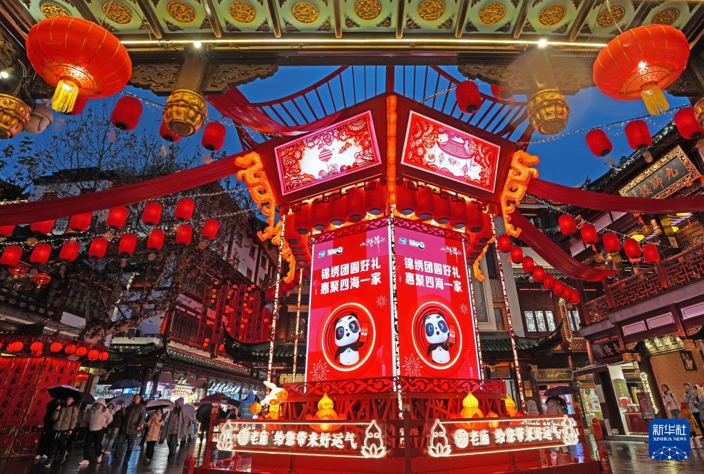 1月26日,豫園燈會上的春聯(lián)與流光溢彩的花燈營造出新春的喜慶氛圍。