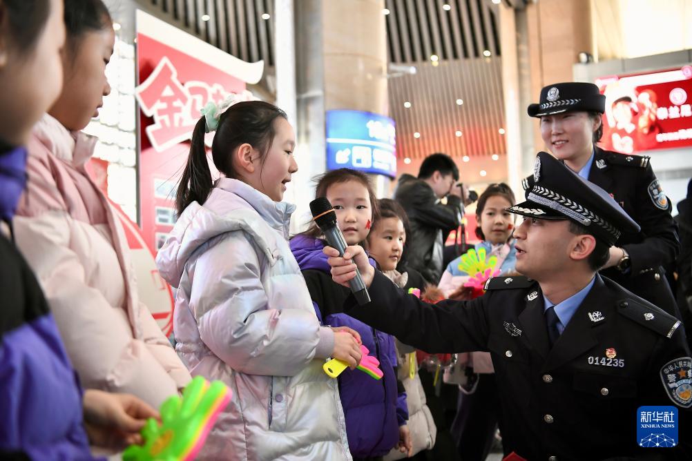 2月2日,在天津站候車廳,天津鐵路公安處民警與旅客小朋友們互動。