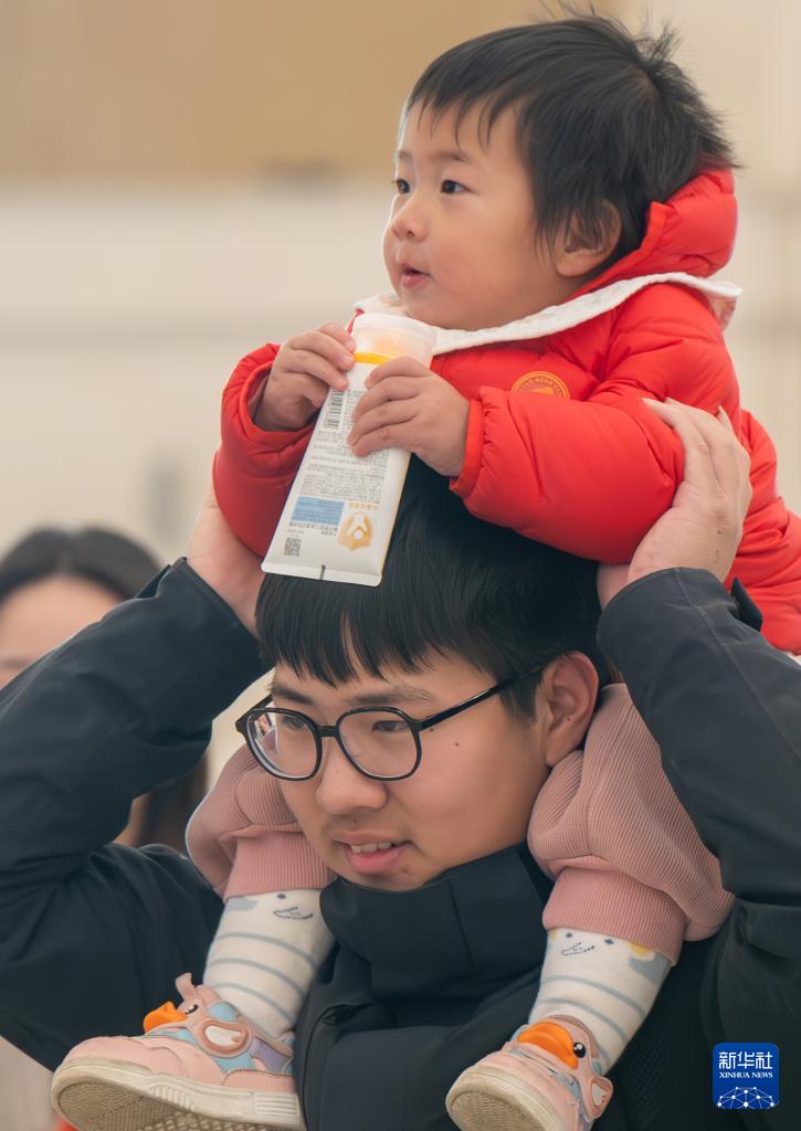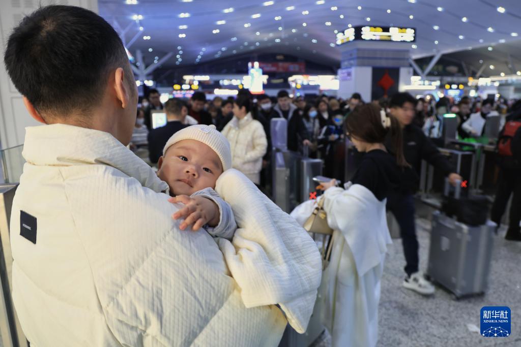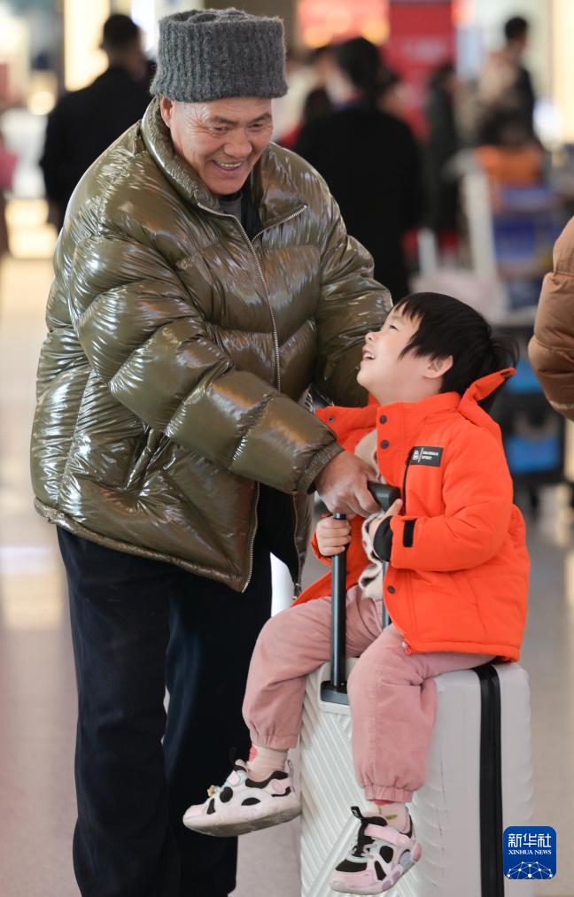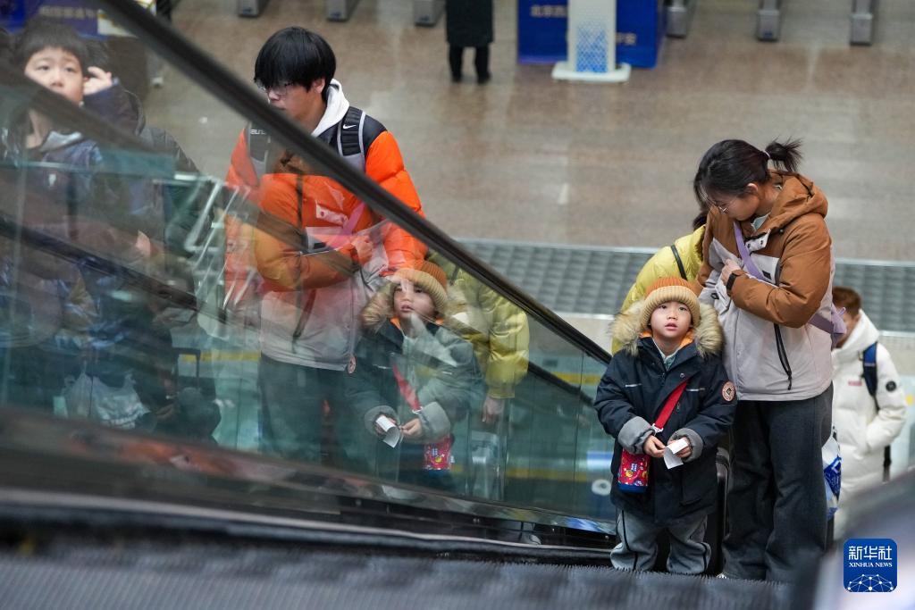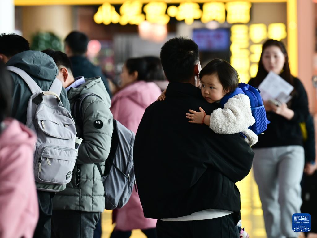 2月2日,在北京西站,小朋友跟隨家長進站乘車。