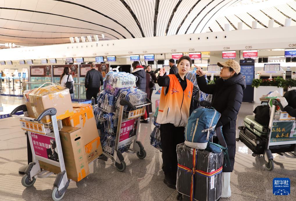 2月2日,北京首都國際機場旅客服務中心工作人員為旅客提供指引、咨詢等服務。