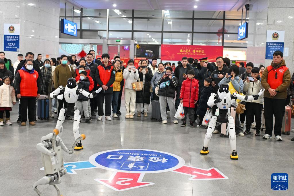 2月2日,乘客在合肥南站觀看機器人拜年表演。