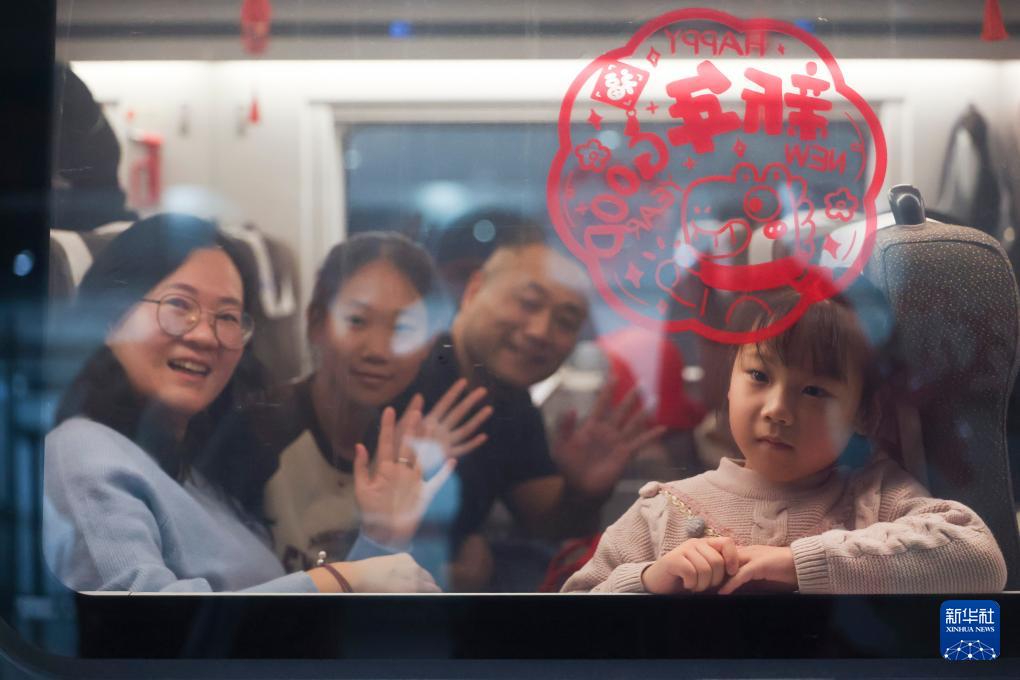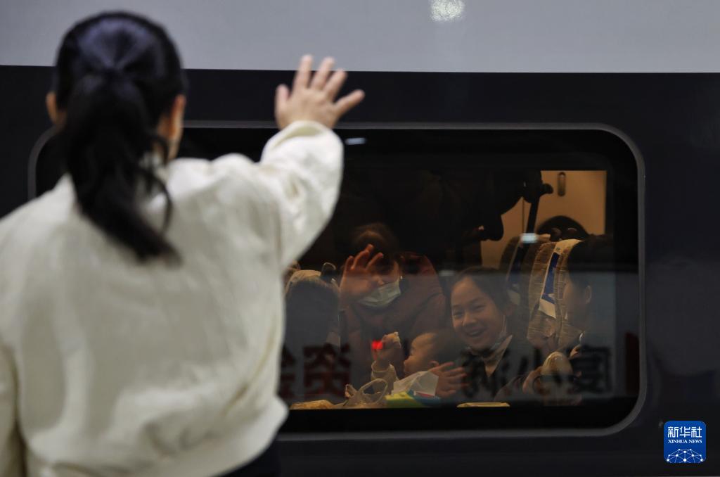 2月1日深夜,在廣州白云站,乘坐K4232次列車的旅客們揮手告別。2月2日凌晨0時01分,開往四川達州的K4232次列車緩緩駛離廣州白云站,這是2026年粵港澳大灣區(qū)開出的首趟春運列車。