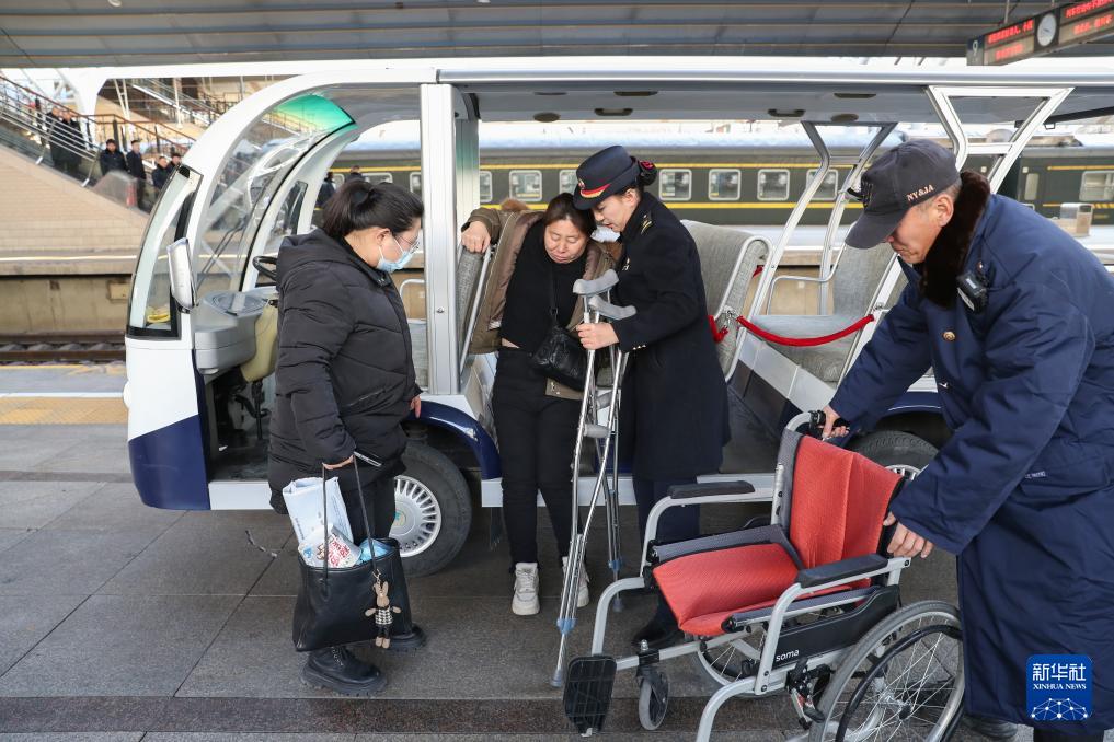 2月2日,北京站京鐵愛心服務組的值班員杜京林(右二)在服務重點旅客。