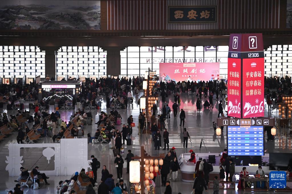 2月2日,旅客在西安站候車大廳的主題文化墻前留影。