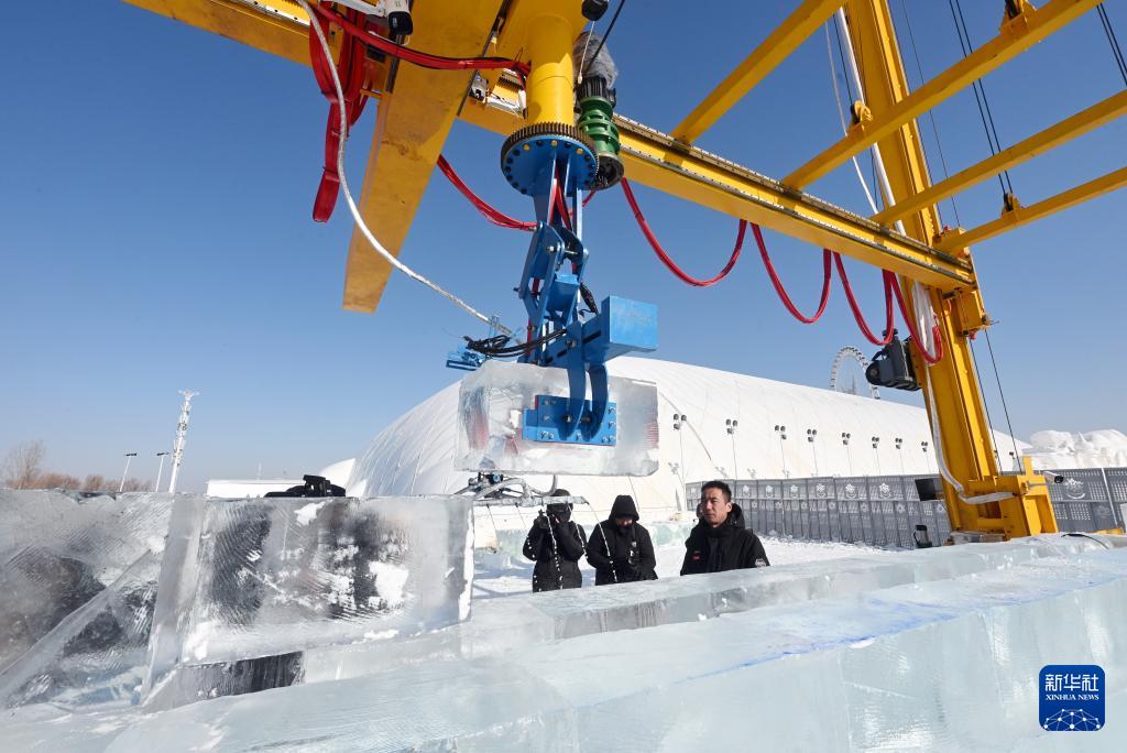 2月3日,在第二十七屆哈爾濱冰雪大世界園區(qū),智能大型冰雕自動化搭建機(jī)器人進(jìn)行冰塊的提升、搬運(yùn)與砌筑。
