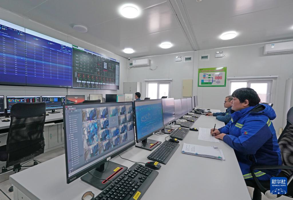 運(yùn)維值班員孫鵬飛(右)在棉船風(fēng)電廠總控室監(jiān)控風(fēng)電機(jī)組的運(yùn)行情況(1月29日攝)。