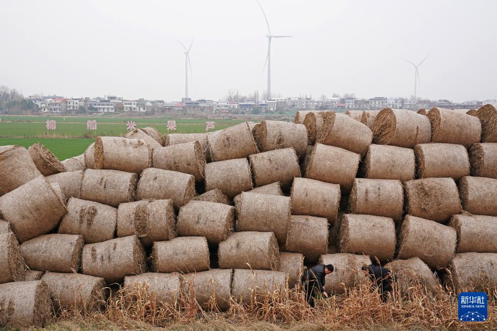 工人在棉船島上清理回收的秸稈,準(zhǔn)備運(yùn)送至島外循環(huán)利用(1月29日攝)。