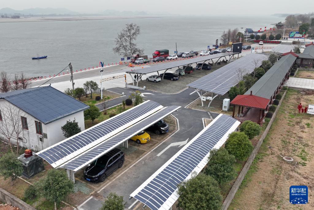 從長(zhǎng)江南岸的江西省九江市馬當(dāng)渡口乘船,十余分鐘即可抵達(dá)棉船島。碼頭停車場(chǎng)的光伏車棚泛著微光,既能為車輛遮風(fēng)擋雨,又能將太陽能轉(zhuǎn)化為清潔電能;遠(yuǎn)處,田間的幾臺(tái)風(fēng)機(jī)在江風(fēng)中緩緩轉(zhuǎn)動(dòng)。
