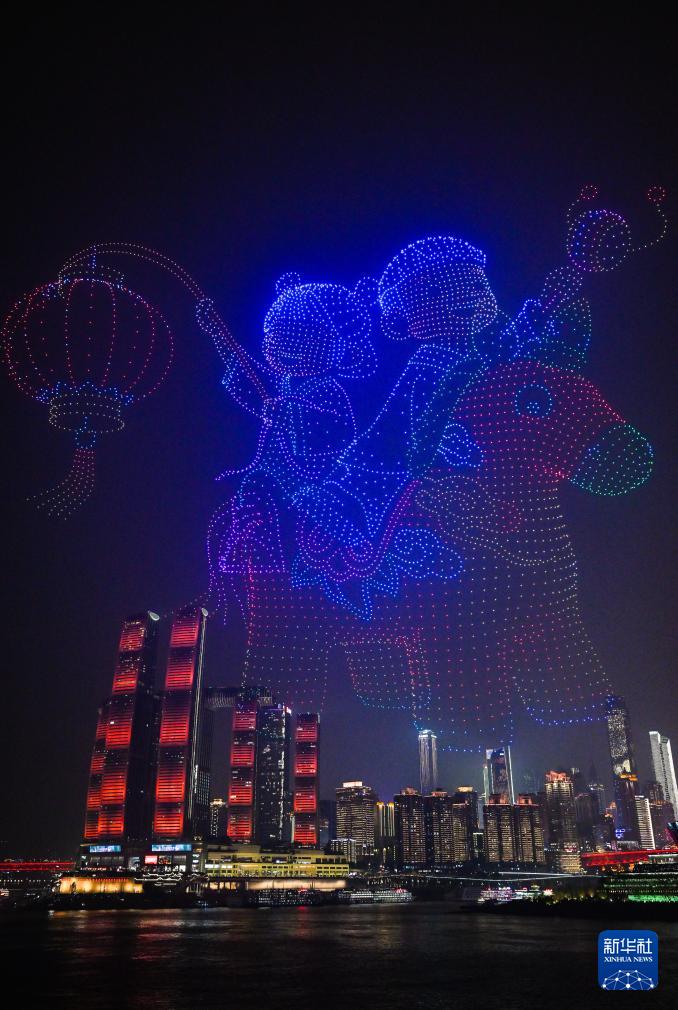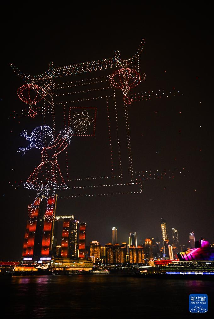 大年初一,“新韻重慶”無人機(jī)燈光秀在重慶夜空上演。無人機(jī)燈光隊(duì)列組成各種創(chuàng)意圖案,點(diǎn)亮夜空,為觀眾獻(xiàn)上視覺盛宴。
