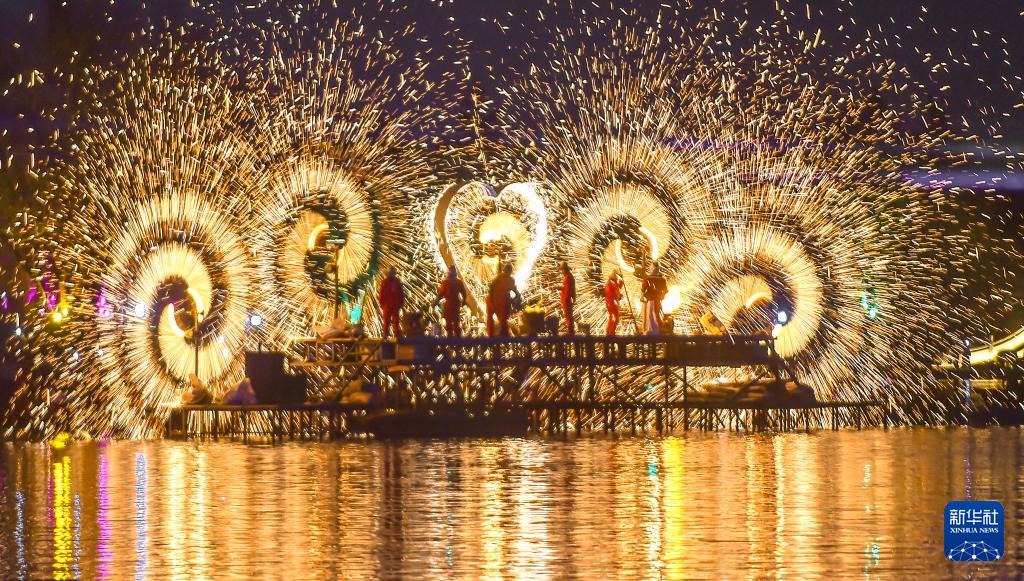 這是2月17日在河南省洛陽(yáng)市隋唐城遺址植物園“神都上元燈會(huì)”上拍攝的水上打鐵花表演。