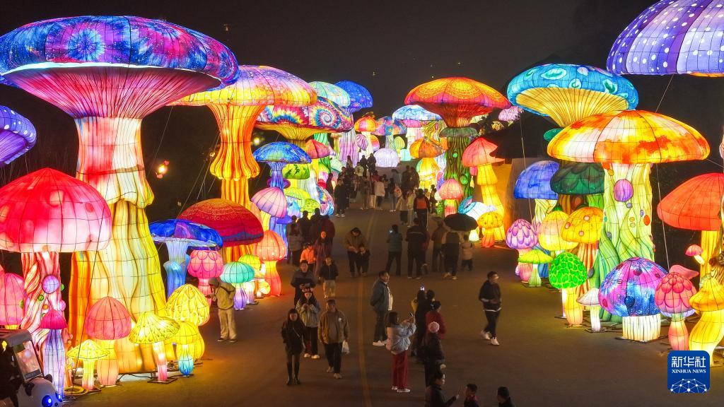 2月17日,游客在貴州省黔西南布依族苗族自治州興義市陽(yáng)光谷旅游度假區(qū)的燈會(huì)上游玩(無人機(jī)照片)。
