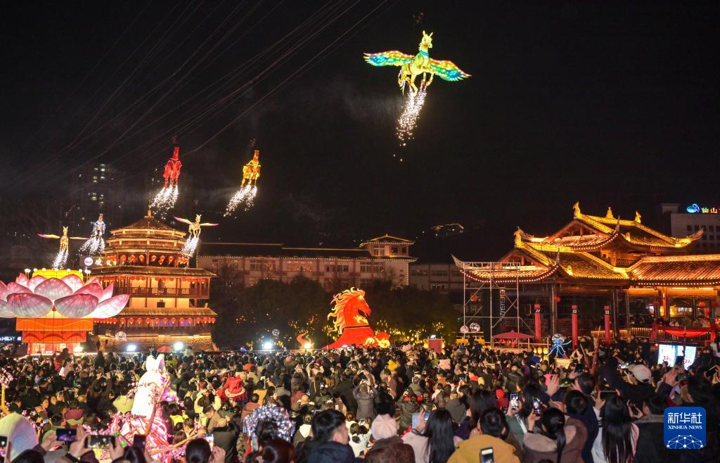2月18日晚,游客在湖北省宣恩縣城觀賞彩燈“駿馬”凌空飛騰。