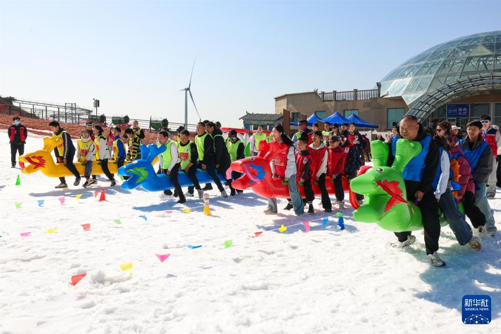 2月21日,游客在湖北省宜昌市夷陵區(qū)的百里荒滑雪場參加趣味活動(dòng)。