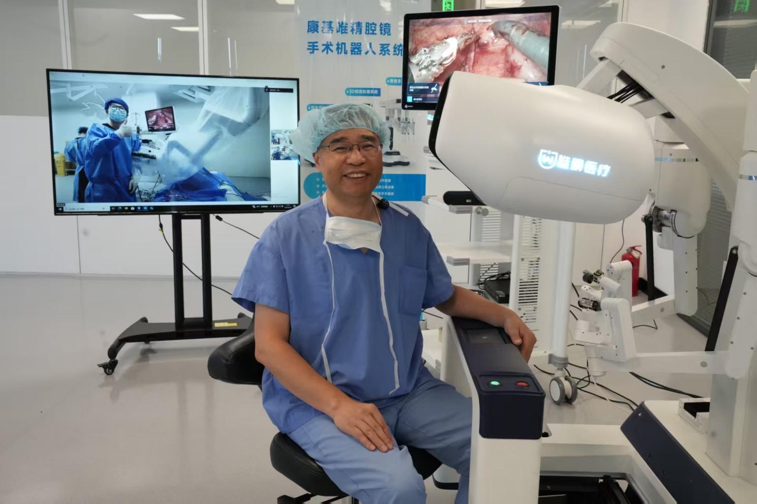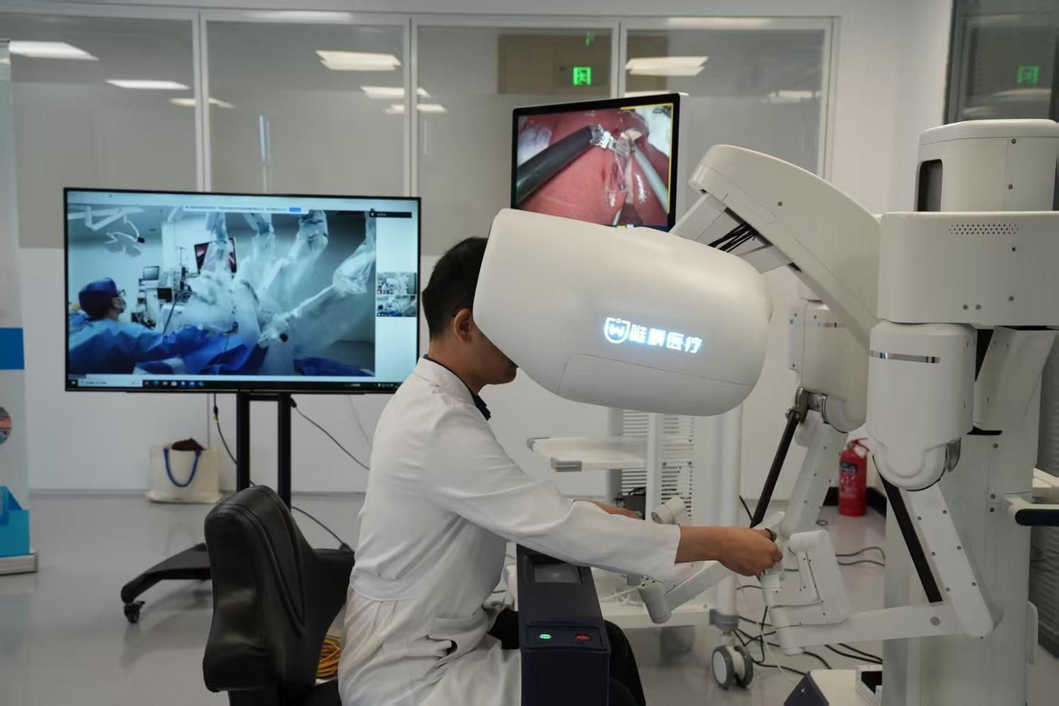 手術(shù)臺(tái)前只有幾位助手,而遠(yuǎn)在千余公里外的主刀醫(yī)生,正穩(wěn)坐操控臺(tái)前,目光緊盯著高清三維顯示屏,通過(guò)手中的指套控制器,精準(zhǔn)地操縱著手術(shù)臺(tái)上的機(jī)械臂,順利完成了一系列復(fù)雜外科操作。