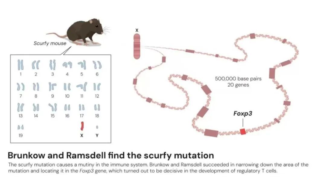 因此,他們決定尋找壞血病小鼠的突變基因。不過,這在20世紀90年代就像大海撈針一樣極為困難,因為小鼠中X染色體的DNA是由約1.7億個堿基配對核苷酸組成。經過大量的艱苦研究和基因檢測,最后他們找到了導致壞血病的基因Foxp3基因。這個基因不只是以前未知的,而且與一組稱為叉頭盒(FOX)的基因有許多相似之處。這些基因調節(jié)其他基因的活性,從而影響細胞發(fā)育。
