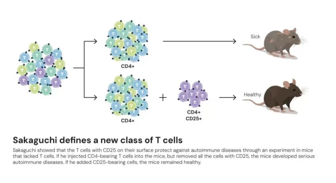 日本名古屋的愛知縣癌癥中心研究所的坂口志文于1995年在《免疫學雜志》上首先發(fā)表研究結果,宣稱發(fā)現(xiàn)了一類全新的T細胞,其特征在于其表面攜帶CD4受體,同時還攜帶一種稱為CD25的受體(蛋白質)。坂口志文設計了一個對小鼠的精巧的實驗,證明小鼠的表面帶有CD4和CD25兩種蛋白的T細胞是控制自身免疫反應的“開關”。把健康小鼠體內的這些細胞移除后,小鼠患上了嚴重的自身免疫病;反之,把這些細胞輸回病鼠體內,則阻止了疾病。