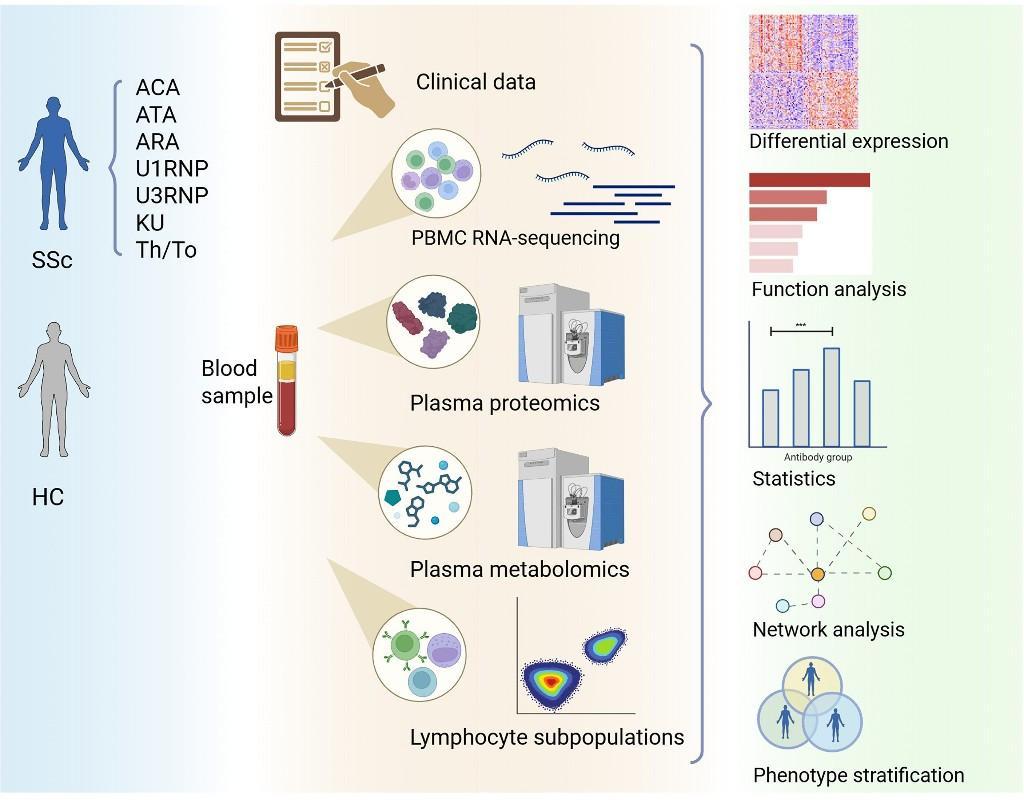 研究團(tuán)隊(duì)根據(jù)患者自身抗體類型,將系統(tǒng)性硬化癥劃分為七個(gè)亞組:ACA、ATA、ARA、U1RNP、U3RNP、Ku及Th/To組。研究團(tuán)隊(duì)整合血漿蛋白質(zhì)組、外周血單個(gè)核細(xì)胞轉(zhuǎn)錄組、免疫細(xì)胞表型及血漿代謝組數(shù)據(jù),為每個(gè)抗體亞組構(gòu)建了系統(tǒng)分子圖譜。