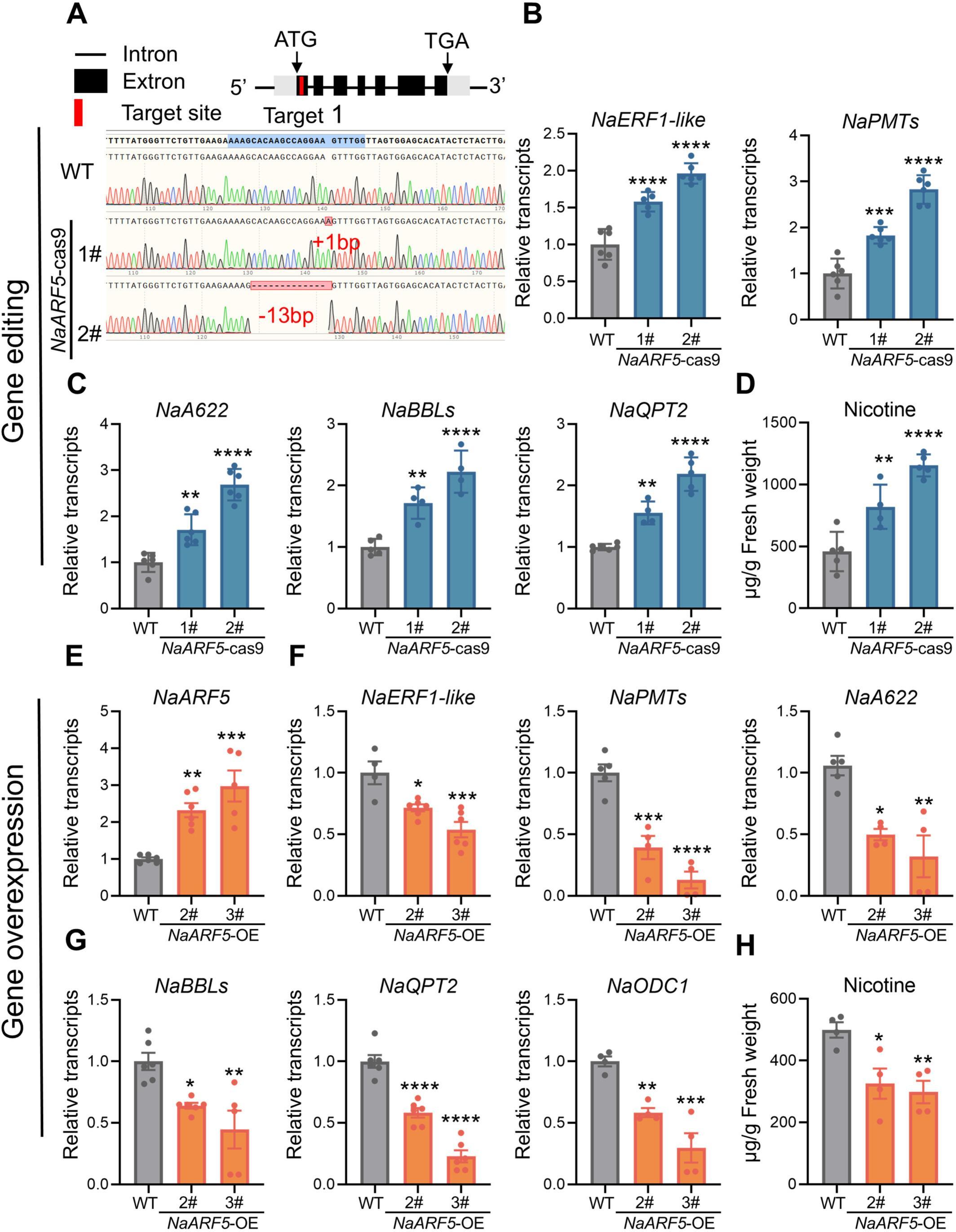 有趣的是,生長素會強烈抑制該轉(zhuǎn)錄因子的表達。順著這一線索,團隊通過酵母雙雜篩庫技術(shù),捕獲到了另一個核心角色——生長素反應因子NaARF5。它就像一個“雙面抑制劑”,一方面受生長素誘導會抑制該轉(zhuǎn)錄因子的表達,另一方面還會直接與其蛋白結(jié)合,削弱對尼古丁合成酶基因的激活能力。