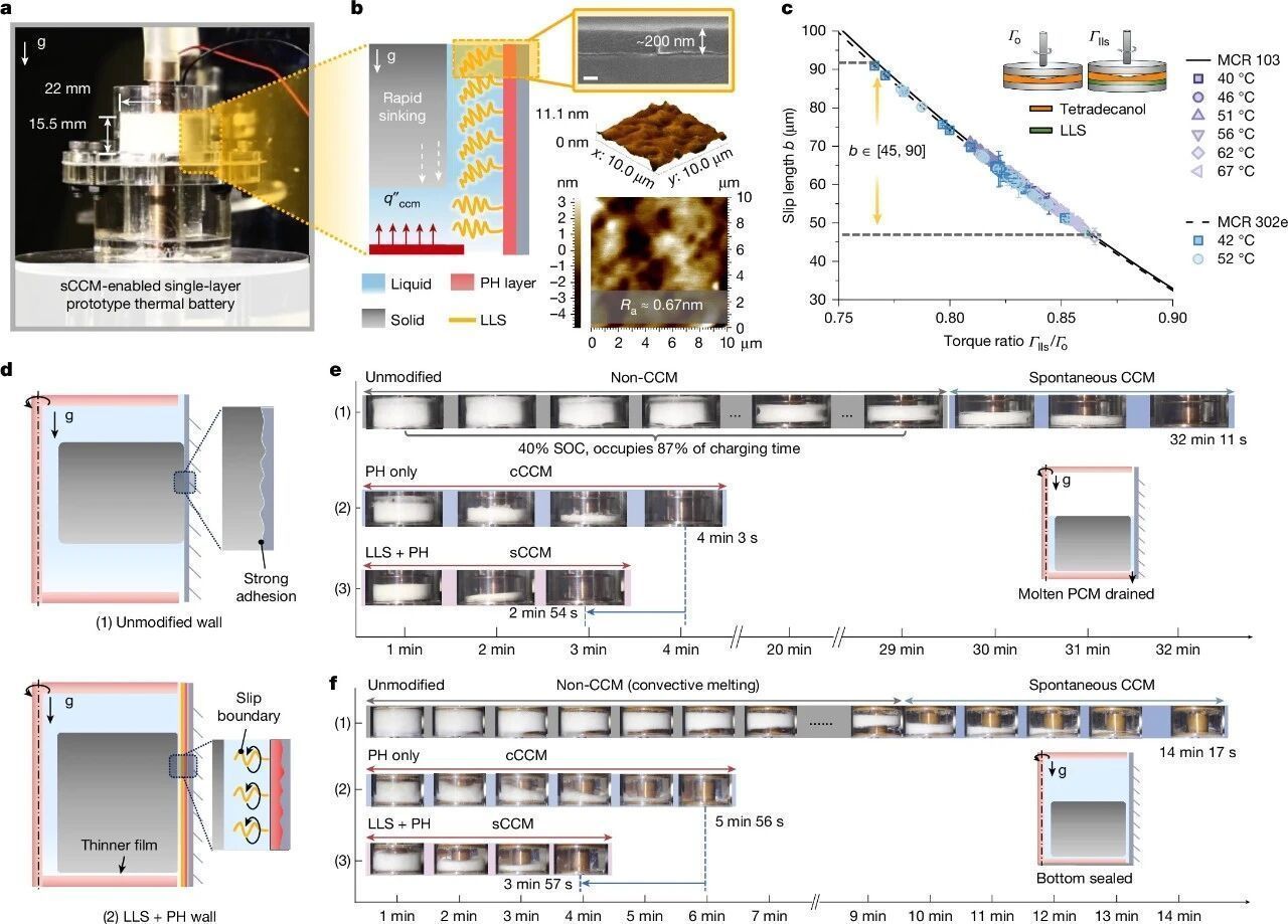 這一核心思路最終落地為“全固態(tài)復(fù)合表面”,其由能脈沖加熱的薄膜(預(yù)熱層)與覆蓋在薄膜表面的“類液涂層”(滑移界面)組成。加熱薄膜通過(guò)產(chǎn)生微小熱量,使緊貼熱池內(nèi)壁的相變材料形成一層約40微米厚的超薄液膜——這個(gè)厚度比一根頭發(fā)絲還細(xì),卻能讓固體相變材料瞬間脫離壁面,在壁面上“滑動(dòng)”;而粗糙度只有不到1納米的類液涂層,能讓液體相變材料在表面形成45—90微米的“滑移長(zhǎng)度”,大幅減少滑動(dòng)時(shí)的摩擦阻力。