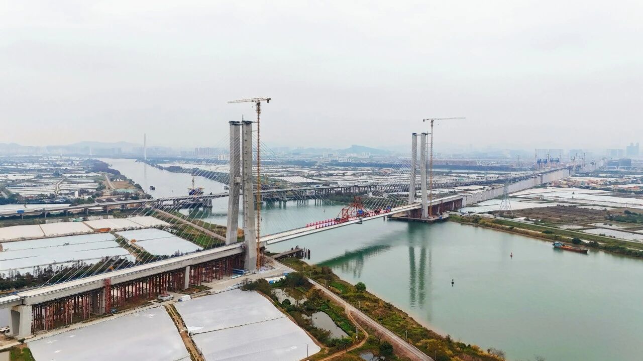 深江鐵路廣中江特大橋跨雞鴉水道橋段位于廣東省中山市境內,全長6896.19米。該橋主橋采用雙塔雙索面組合梁斜拉橋結構,全長788.9米,主塔最高達140米,共設64對斜拉索。大橋施工具有“結構體系新、塔高跨度大、集成智能化”等特點。