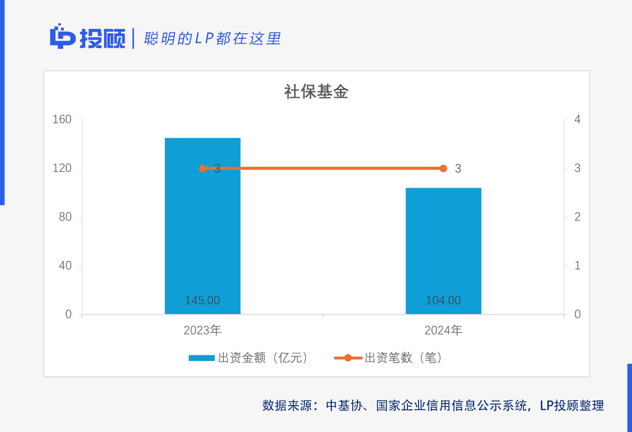 LP數(shù)量方面,2024年,4556家機(jī)構(gòu)LP中,社保、險(xiǎn)資、銀行及信托共85家,較2023年(96家)同比減少11.46%,三者在機(jī)構(gòu)LP數(shù)量中占比1.87%(2023年2.19%)。出資筆數(shù)方面,2024年,社?;稹⒈kU(xiǎn)資金、銀行及信托合計(jì)出資151筆,較2023年(181筆)同比減少16.57%;三者在出資筆數(shù)總數(shù)(6096筆)中合計(jì)占比2.48%(2023年3.20%)。出資金額方面,2024年,社保基金、保險(xiǎn)資金、銀行及信托合計(jì)認(rèn)繳出資1409.76億元,較2023年(1865.81億元)同比減少24.44%;三者合計(jì)出資在出資總額中占比9.17%(2023年11.99%)。