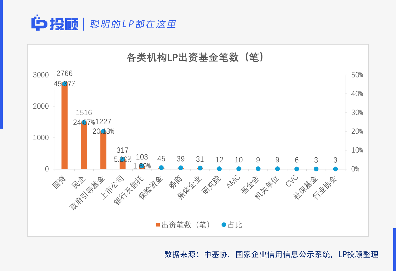 另一方面,出資10億元及以上的288家機(jī)構(gòu)LP中,國資170家,政府引導(dǎo)基金73家,二者合計(jì)占比高達(dá)84.38%,而民企和上市公司僅14家,占比4.86%;出資50億元及以上的39家機(jī)構(gòu)LP中,國資22家,政府引導(dǎo)基金11家,二者合計(jì)占比高達(dá)84.62%;而民企及上市公司僅1家。頭部出資主體中,國資和政府引導(dǎo)基金已成為出資主力,實(shí)力遠(yuǎn)高于民企及上市公司等市場(chǎng)化LP。