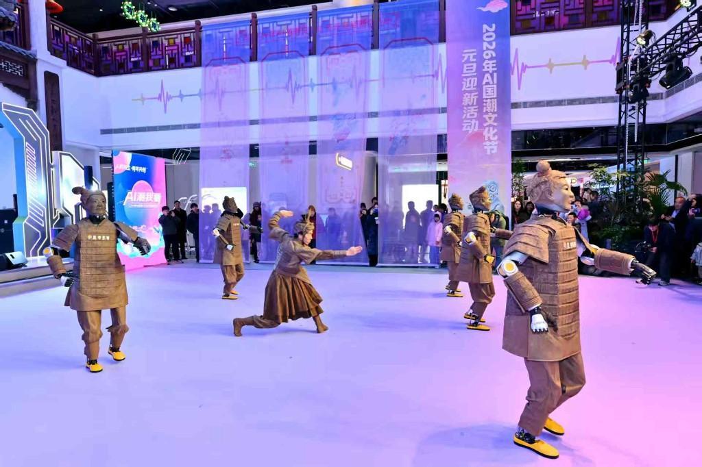 開(kāi)幕式上,AI數(shù)字長(zhǎng)河宣傳片首發(fā),中央民族大學(xué)學(xué)子與機(jī)器人四手聯(lián)彈主題曲,中央民族歌舞團(tuán)與宇樹(shù)機(jī)器人共舞《駿馬歸來(lái)》,獲世界人形機(jī)器人運(yùn)動(dòng)會(huì)金牌的《秦俑魂》人機(jī)共舞節(jié)目亮相街區(qū)。
