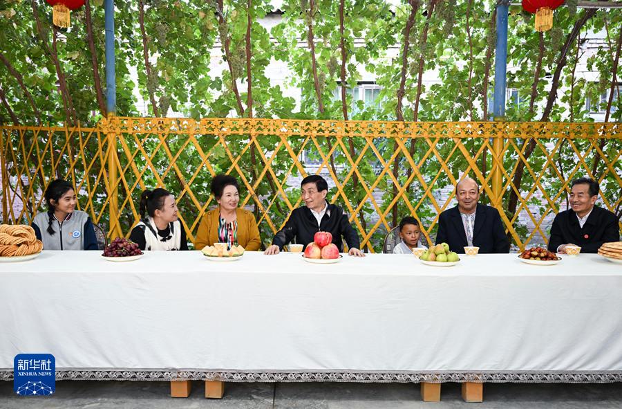 9月25日下午,受習(xí)近平總書(shū)記囑托,中共中央政治局常委、全國(guó)政協(xié)主席、中央代表團(tuán)團(tuán)長(zhǎng)王滬寧帶領(lǐng)中央代表團(tuán)部分成員在巴音郭楞蒙古自治州庫(kù)爾勒市看望慰問(wèn)當(dāng)?shù)馗髯甯刹咳罕姟_@是王滬寧和中央代表團(tuán)部分成員在庫(kù)爾勒市阿瓦提鄉(xiāng)吾夏克鐵熱克村了解鄉(xiāng)村產(chǎn)業(yè)發(fā)展和群眾生產(chǎn)生活情況。新華社記者 張領(lǐng) 攝
