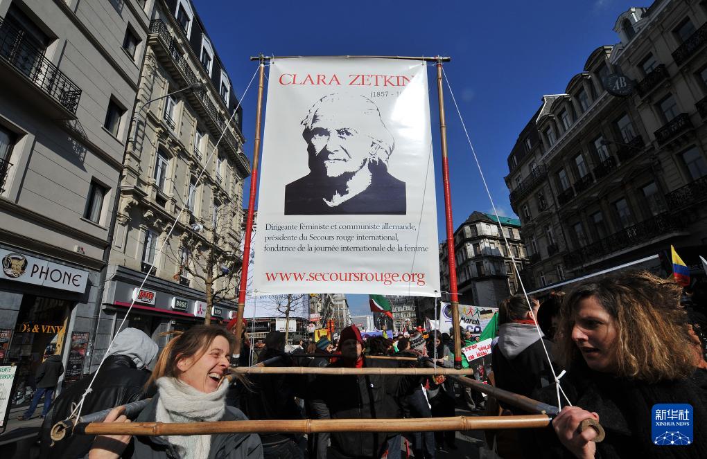 2010年3月6日,在比利時首都布魯塞爾,婦女代表抬著著名女政治活動家、三八國際婦女節(jié)的倡導(dǎo)者克拉拉·蔡特金的畫像參加慶祝三八國際勞動?jì)D女節(jié)游行。新華社記者 武巍 攝