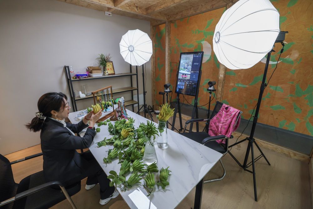 在浙江金華市金東區(qū)赤松鎮(zhèn)北山口村的金華佛手農(nóng)林服務(wù)中心內(nèi)的直播間,工作人員進行佛手鮮果及衍生產(chǎn)品的直播銷售(2025年10月22日攝)。新華社記者 徐昱 攝